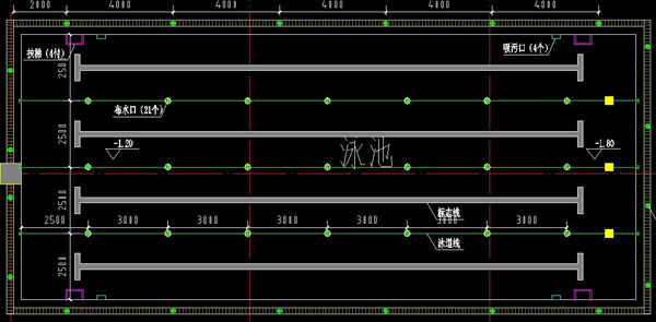 游泳池的給水方式有兩種:池壁水平給水和池底垂直給水,且兩者給水方式獨立使用。池壁水平給水,施工、安裝和運行都很方便,它是一種最常用的給水方式,但是它的缺點是熱量分布和化學(xué)投加不均勻;池底垂直給水最大的優(yōu)點就是熱量分布和化學(xué)投加比較均勻,但是它施工、安裝較難。