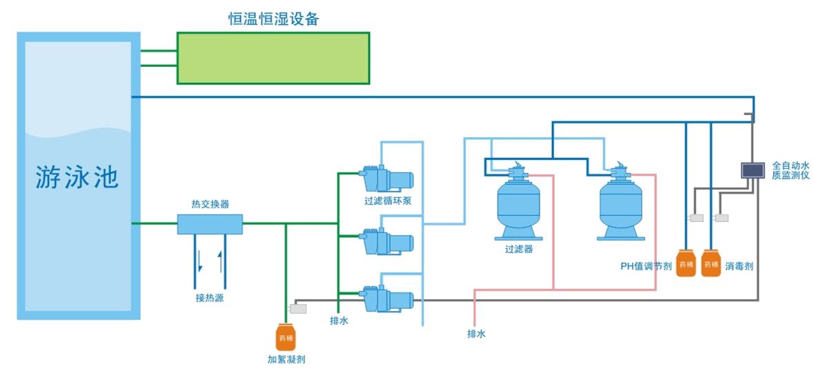 不管你是想要建一個什么樣規(guī)格的泳池,私人別墅或是酒店水療戲水按摩泳池亦或是學校比賽的標準泳池,一個泳池的基本水處理設備都是大同小異的。
