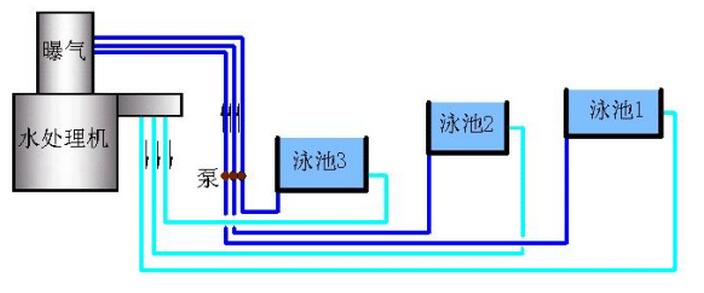 我們作過(guò)7個(gè)泳池使用1套水處理設(shè)備的工程,已經(jīng)過(guò)多年運(yùn)營(yíng),實(shí)踐證明效果極佳。