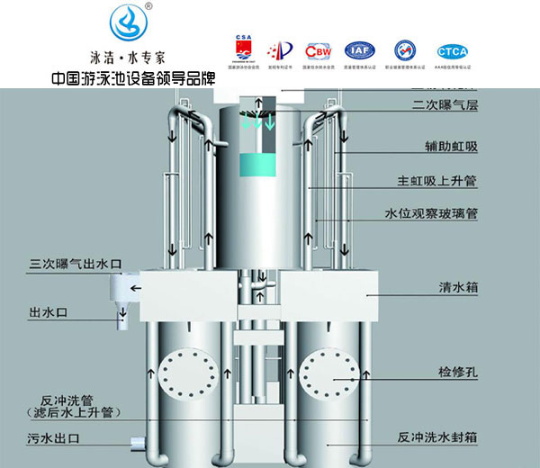池水在重力作用下自流到設備,處理后的清水經水泵送到池中。水處理過程中,水泵在濾機的后面。當水面的同層沒有空間設置機房時,可作機后泵水處理系統(tǒng)。當選用全自動曝氣濾機時,機房地面必須低于池水面4.5米以上;當選用組合式濾機時,機房地面必須低于水面4米以上(個別機型可低于3.2米以上)。機后泵系統(tǒng)機房內需要設置集水坑、排污泵(排污量不宜過小)和通風。此系統(tǒng)設備多于機前泵系統(tǒng),投資也高于機前泵系統(tǒng),通風、排水不如機前泵系統(tǒng)方便。