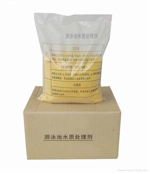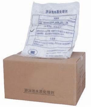泳池放滿水后,(視水質(zhì)情況)投放TCCA片劑,速溶片劑按每m32-4g量直接均勻地撇如池水中,藥片沉入池底月15分鐘即完全溶解。放藥時間選擇收場后或早上無人游泳時。正常時間最好在開放前1-2小時加藥。緩溶片劑在循環(huán)系統(tǒng)加藥裝置投加。絮凝劑可依據(jù)水質(zhì)渾濁度的標準來施放。不符合此標準應(yīng)投放,絮凝劑一般每星期1-2次。用量沒1000m3水放5-10kg,投放前應(yīng)測試水中PH值,如PH值偏低(<7)應(yīng)加PH。