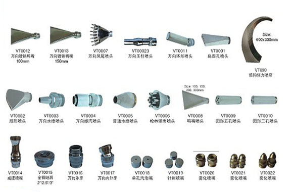 萬向鳳尾噴頭、萬向玉柱噴頭、萬向環形噴頭、弧鉤強力噴簾、扇形噴頭、萬向水錘噴頭、槍林彈雨、鴨嘴噴頭等等。